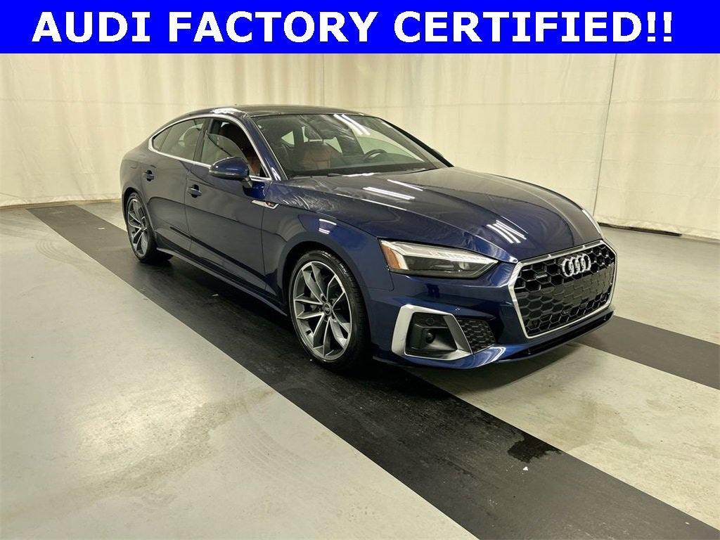 2024 Audi A5 Sportback 45 S line Premium quattro 7-Speed Automatic S tronic 2.0L 4-Cylinder TFSI Navarra Blue Metallic With Okapi Brown Interior, Heated Seats, Heated Power Mirrors, LED Interior Lighting, Heated Steering Wheel, Panoramic Sunroof, Sport Suspension