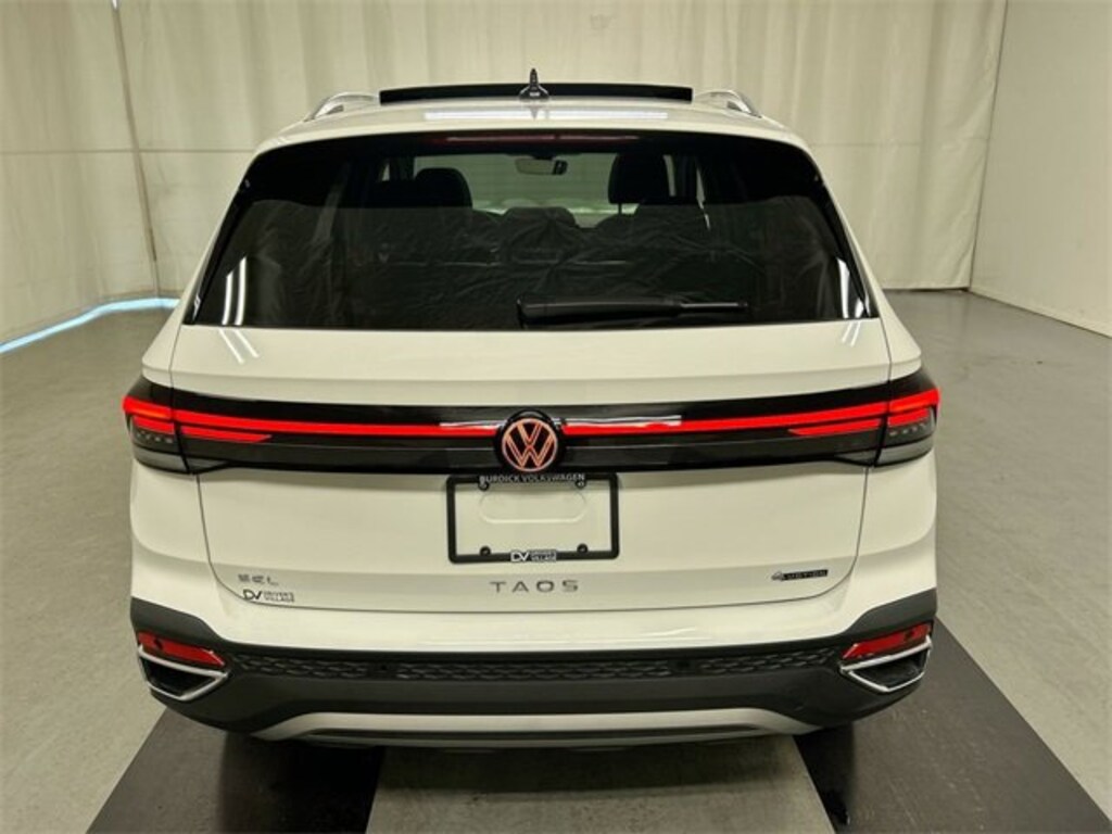 Certified. Pure White 2025 Volkswagen Taos 1.5T SEL AWD 8-Speed Automatic with Tiptronic 1.5L I4 Turbocharged DOHC 16V LEV3-SULEV30 174hp **Qualifies for VW new car rebate! (currently 3,000.00), Heated front seats, Navigation system: VW Car-Net Guide & Inform, Power moonroof.