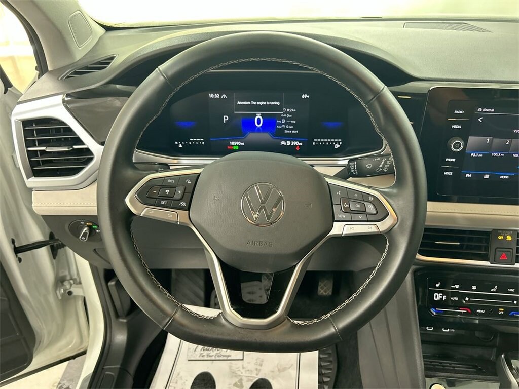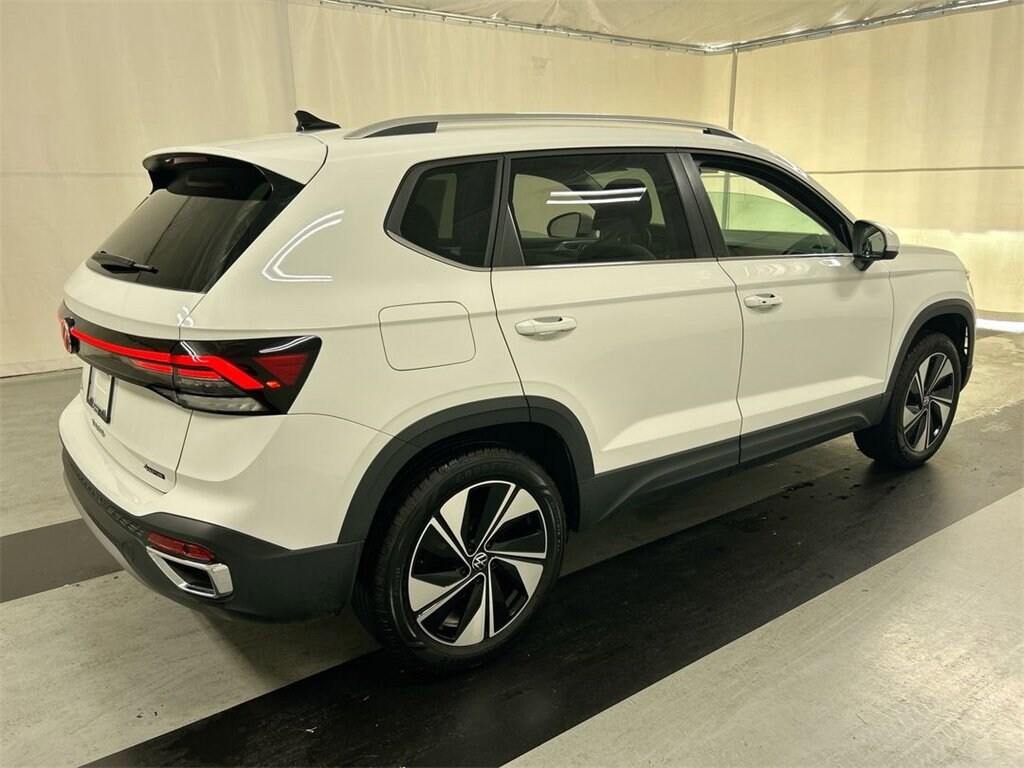 Certified. Pure White 2025 Volkswagen Taos 1.5T SE AWD 8-Speed Automatic with Tiptronic 1.5L I4 Turbocharged DOHC 16V LEV3-SULEV30 174hp